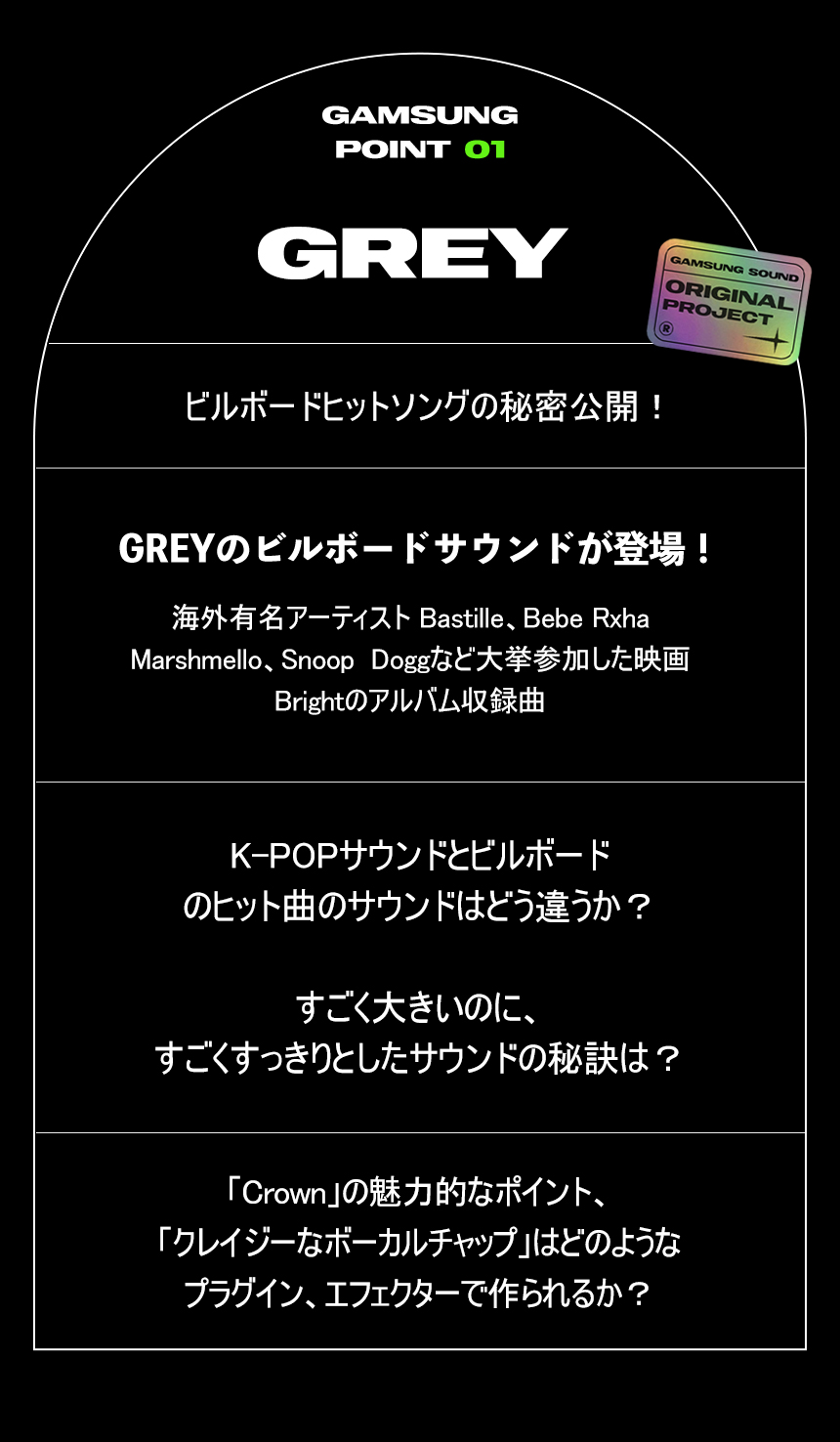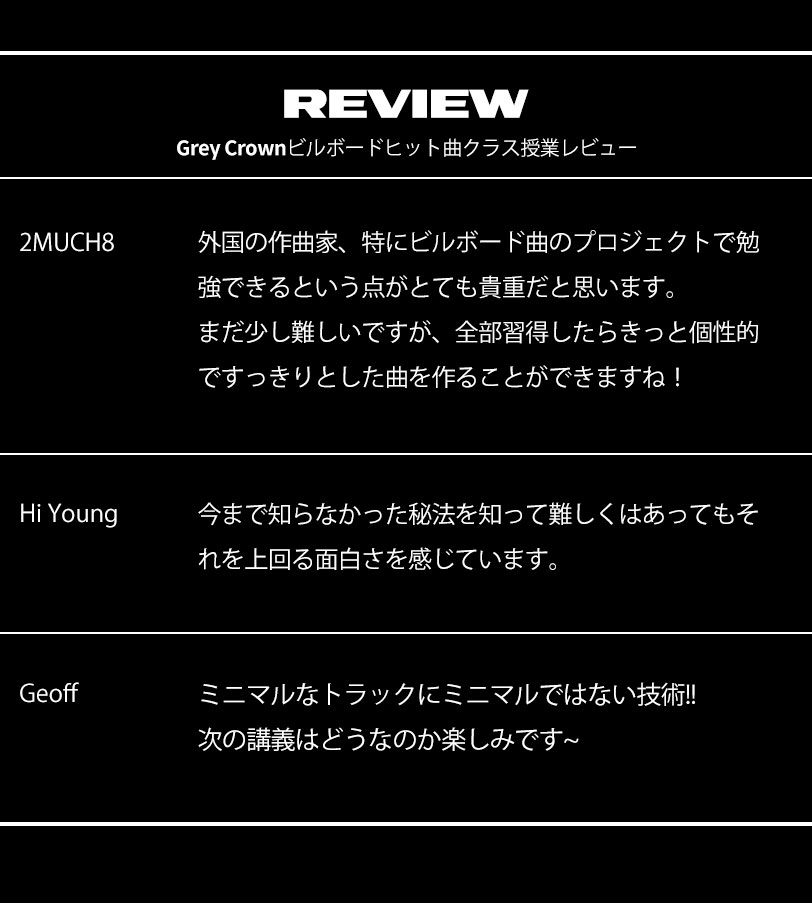 ]YOUTUBE再生数1.2億の「Zedd, Maren Morris, Grey - The Middle」、3億の「Hailee Steinfeld, Grey - Starving ft. Zedd」などで数回ビルボードチャート進入に成功し 音楽市場の中で自分だけの方向性を構築している。長い経験で広いスペクトラムの音楽を制作してきた彼らが、自分だけの音楽の話とノウハウを伝えようとする。